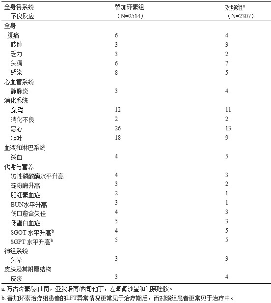 在多個臨床研究中,共有2514例患者接受了替加環素治療,其中7%患者因治療中出現不良反應而中止替加環素治療,而所有對照組患者中6%因治療中出現不良反應而中止治療。